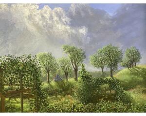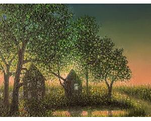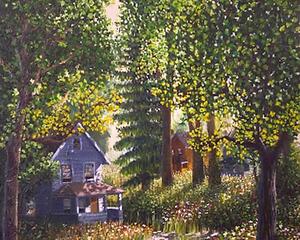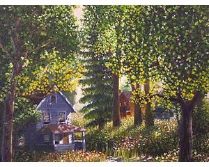 Summer Arbor Landscape Print -Whimsical print of 3 Cottages b...
